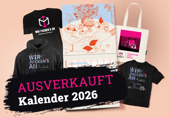 Mit unseren Soli-Merchandise setzt du ein aktives Zeichen, dass du Menschen nicht vergisst, die vor Krieg, Armut, Perspektivlosigkeit und den Auswirkungen der Klimakatastrophe fliehen müssen. Mit deinem Soli-Beitrag machst du einen Unterschied und unterstützt ganz direkt notleidende Geflüchtete am Rande Europas.